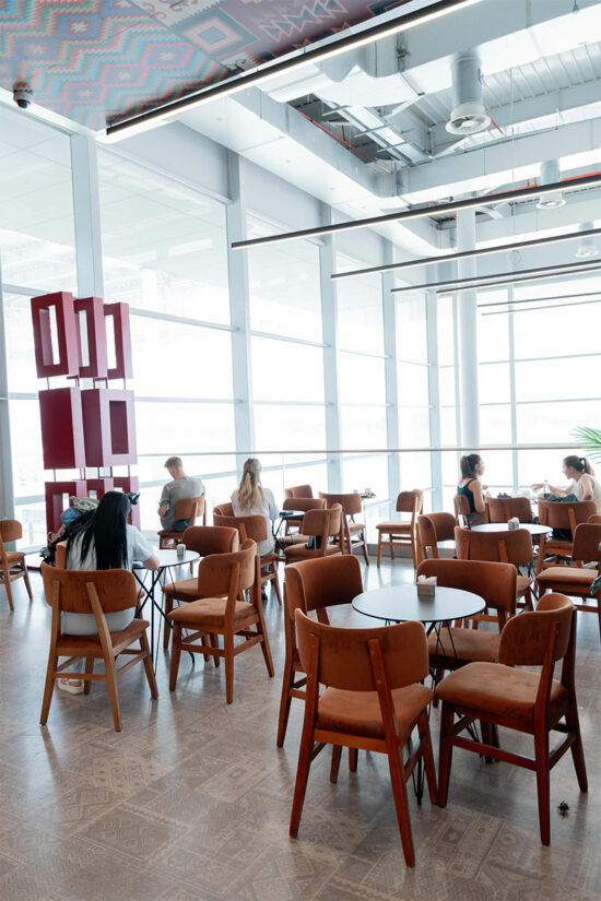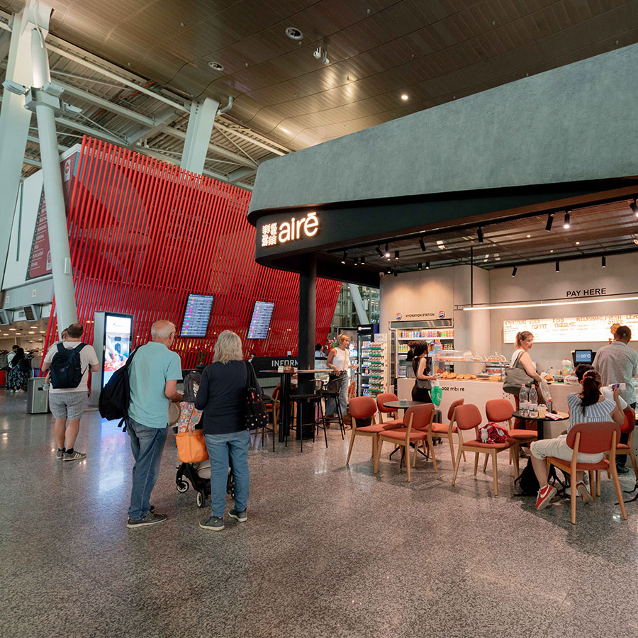 Në katin e dytë të Zonës së Nisjeve, do të gjeni një ambient modern alternativ, perfekt për të kaluar kohën në pritje të fluturimit tuaj, me përzgjedhje të pasur pijesh e ushqimesh.